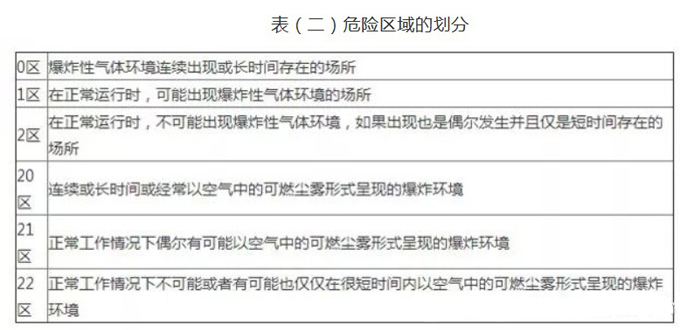 根據(jù)爆炸性環(huán)境的頻率和持續(xù)的時(shí)間把危險(xiǎn)場所劃分為不同的區(qū)域。氣體場所劃分為三個(gè)區(qū)域:0區(qū),1區(qū)和2區(qū);粉塵場所分為三個(gè)區(qū)域:20區(qū),21區(qū)和22區(qū)。如表(二)所示: