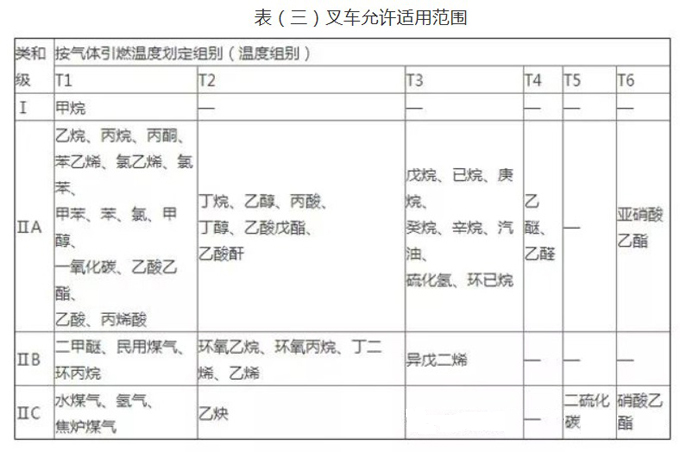 對于I、II區(qū)爆炸性氣體環(huán)境表(三)為叉車允許適用范圍,表(四)為危險(xiǎn)區(qū)域的溫度組別劃分。