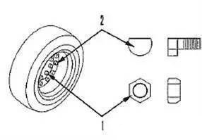 6.將一個(gè)替換輪胎安裝至輪轂。暫時(shí)地?cái)Q緊輪轂螺母(1) ,對(duì)角地?cái)Q緊螺母。