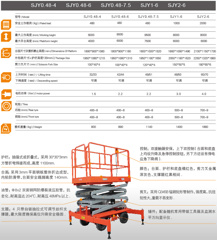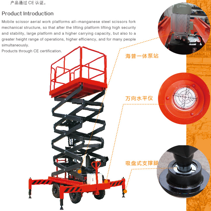 移動剪叉式高空作業(yè)平臺采用全錳鋼剪刀式機械結構,使升降臺起升后有很高的安全穩(wěn)定性,寬大的作業(yè)平臺和較高的承載能力,也使高空作業(yè)范圍更大,效率更高,并適合多人同時作業(yè)。